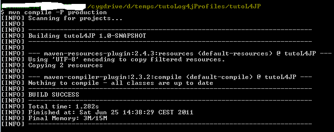 /cygdrive/d/temps/tutoLog4jProfiles/tutoL4JP $ mvn exec:java -Dexec.mainClass=com.tutoLog4JProfiles.App [INFO] Scanning for projects... [INFO] [INFO] ------------------------------------------------------------------------ [INFO] Building tutoL4JP 1.0-SNAPSHOT [INFO] ------------------------------------------------------------------------ [INFO] [INFO] >>> exec-maven-plugin:1.2:java (default-cli) @ tutoL4JP >>> [INFO] [INFO] <<< exec-maven-plugin:1.2:java (default-cli) @ tutoL4JP <<< [INFO] [INFO] --- exec-maven-plugin:1.2:java (default-cli) @ tutoL4JP --- Counter = 1 2011-06-25 14:10:52,849 com.tutoLog4JProfiles.App DEBUG - App message with DEBUG level 2011-06-25 14:10:52,876 com.tutoLog4JProfiles.App INFO - App message with INFO level 2011-06-25 14:10:52,877 com.tutoLog4JProfiles.App WARN - App message with WARN level 2011-06-25 14:10:52,878 com.tutoLog4JProfiles.App ERROR - App message with ERROR level 2011-06-25 14:10:52,878 com.tutoLog4JProfiles.App FATAL - App message with FATAL level Counter = 2 2011-06-25 14:10:52,879 com.tutoLog4JProfiles.App DEBUG - App message with DEBUG level 2011-06-25 14:10:52,880 com.tutoLog4JProfiles.App INFO - App message with INFO level 2011-06-25 14:10:52,880 com.tutoLog4JProfiles.App WARN - App message with WARN level 2011-06-25 14:10:52,881 com.tutoLog4JProfiles.App ERROR - App message with ERROR level 2011-06-25 14:10:52,881 com.tutoLog4JProfiles.App FATAL - App message with FATAL level Counter = 3 2011-06-25 14:10:52,882 com.tutoLog4JProfiles.App DEBUG - App message with DEBUG level 2011-06-25 14:10:52,882 com.tutoLog4JProfiles.App INFO - App message with INFO level 2011-06-25 14:10:52,883 com.tutoLog4JProfiles.App WARN - App message with WARN level 2011-06-25 14:10:52,883 com.tutoLog4JProfiles.App ERROR - App message with ERROR level 2011-06-25 14:10:52,884 com.tutoLog4JProfiles.App FATAL - App message with FATAL level Counter = 4 2011-06-25 14:10:52,885 com.tutoLog4JProfiles.App DEBUG - App message with DEBUG level 2011-06-25 14:10:52,886 com.tutoLog4JProfiles.App INFO - App message with INFO level 2011-06-25 14:10:52,887 com.tutoLog4JProfiles.App WARN - App message with WARN level 2011-06-25 14:10:52,887 com.tutoLog4JProfiles.App ERROR - App message with ERROR level 2011-06-25 14:10:52,887 com.tutoLog4JProfiles.App FATAL - App message with FATAL level Counter = 5 2011-06-25 14:10:52,888 com.tutoLog4JProfiles.App DEBUG - App message with DEBUG level 2011-06-25 14:10:52,889 com.tutoLog4JProfiles.App INFO - App message with INFO level 2011-06-25 14:10:52,889 com.tutoLog4JProfiles.App WARN - App message with WARN level 2011-06-25 14:10:52,890 com.tutoLog4JProfiles.App ERROR - App message with ERROR level 2011-06-25 14:10:52,890 com.tutoLog4JProfiles.App FATAL - App message with FATAL level Counter = 6 2011-06-25 14:10:52,891 com.tutoLog4JProfiles.App DEBUG - App message with DEBUG level 2011-06-25 14:10:52,909 com.tutoLog4JProfiles.App INFO - App message with INFO level 2011-06-25 14:10:52,910 com.tutoLog4JProfiles.App WARN - App message with WARN level 2011-06-25 14:10:52,910 com.tutoLog4JProfiles.App ERROR - App message with ERROR level 2011-06-25 14:10:52,911 com.tutoLog4JProfiles.App FATAL - App message with FATAL level Counter = 7 2011-06-25 14:10:52,913 com.tutoLog4JProfiles.App DEBUG - App message with DEBUG level 2011-06-25 14:10:52,913 com.tutoLog4JProfiles.App INFO - App message with INFO level 2011-06-25 14:10:52,914 com.tutoLog4JProfiles.App WARN - App message with WARN level 2011-06-25 14:10:52,914 com.tutoLog4JProfiles.App ERROR - App message with ERROR level 2011-06-25 14:10:52,914 com.tutoLog4JProfiles.App FATAL - App message with FATAL level Counter = 8 2011-06-25 14:10:52,924 com.tutoLog4JProfiles.App DEBUG - App message with DEBUG level 2011-06-25 14:10:52,924 com.tutoLog4JProfiles.App INFO - App message with INFO level 2011-06-25 14:10:52,925 com.tutoLog4JProfiles.App WARN - App message with WARN level 2011-06-25 14:10:52,926 com.tutoLog4JProfiles.App ERROR - App message with ERROR level 2011-06-25 14:10:52,926 com.tutoLog4JProfiles.App FATAL - App message with FATAL level Counter = 9 2011-06-25 14:10:52,928 com.tutoLog4JProfiles.App DEBUG - App message with DEBUG level 2011-06-25 14:10:52,928 com.tutoLog4JProfiles.App INFO - App message with INFO level 2011-06-25 14:10:52,928 com.tutoLog4JProfiles.App WARN - App message with WARN level 2011-06-25 14:10:52,929 com.tutoLog4JProfiles.App ERROR - App message with ERROR level 2011-06-25 14:10:52,929 com.tutoLog4JProfiles.App FATAL - App message with FATAL level [INFO] ------------------------------------------------------------------------ [INFO] BUILD SUCCESS [INFO] ------------------------------------------------------------------------ [INFO] Total time: 1.681s [INFO] Finished at: Sat Jun 25 14:10:52 CEST 2011 [INFO] Final Memory: 4M/15M [INFO] ------------------------------------------------------------------------